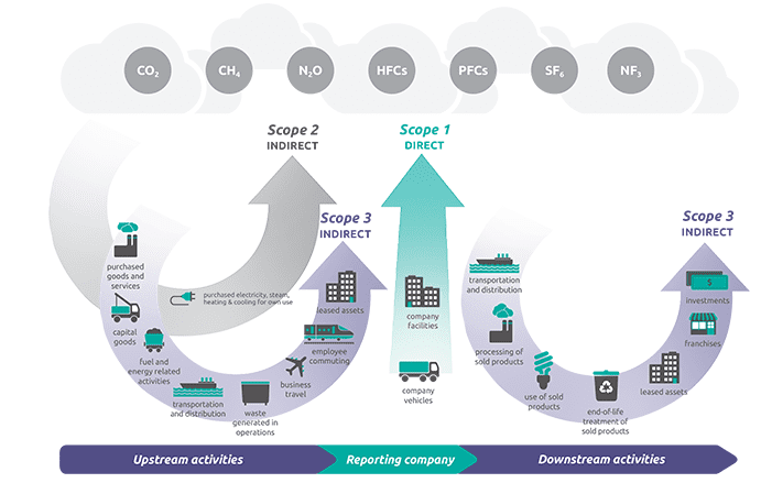 In het kader van het internationale Greenhouse Gas (GHG) Protocol is een standaard ontwikkeld voor het rapporteren van emissies van broeikasgassen van bedrijven. Deze standaard schrijft voor dat bedrijven hun emissies rapporteren in drie scopes. Scope 1 en 2 gaat over de eigen bedrijfsvoering: directe emissies uit eigen gebouwen en voertuigen en indirecte emissies door opwekking van eigen energiegebruik. Scope 3 betreft de overige emissies die indirect ontstaan als gevolg van activiteiten van het bedrijf maar waarvan de installaties niet door het bedrijf beheerd worden. Denk bijvoorbeeld aan emissies van ingekochte diensten (transport en afval) of ingekochte materialen en producten. Lees verder over scope 1, 2 en 3 in een CO2-footprint.